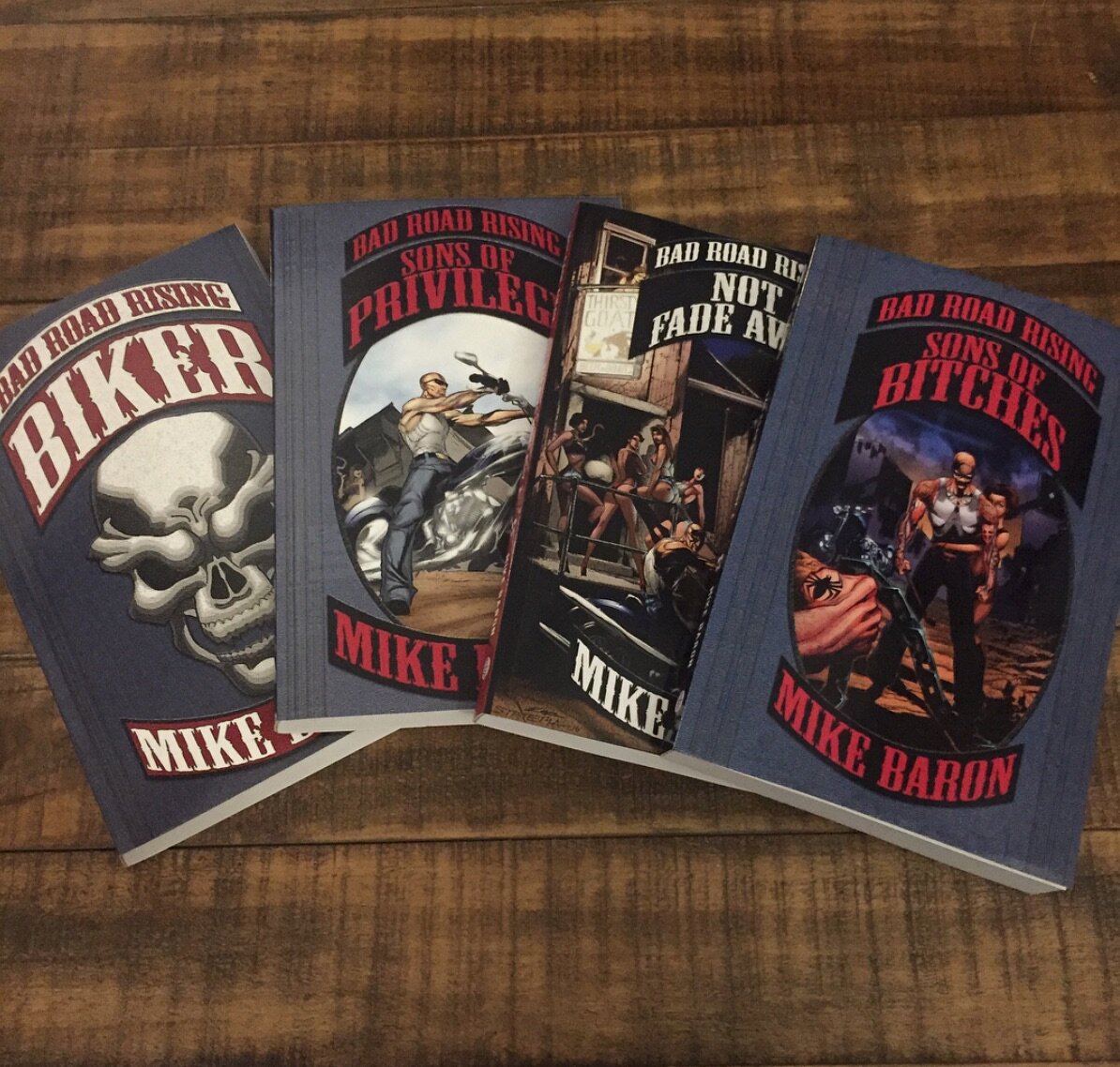 Baron has published seven novels, Banshees, Domain, Helmet Head, Whack Job, Biker, Sons of Privilege, Not Fade Away, Sons of Bitches, Skorpio, and Disco. Banshees is about a satanic rock band that returns from the dead. Helmet Head is about Nazi biker zombies. Whack Job is about spontaneous human combustion. Biker is hard-boiled crime about a reformed motorcycle hoodlum turned private investigator. Skorpio is about a ghost who only appears under a blazing sun.
