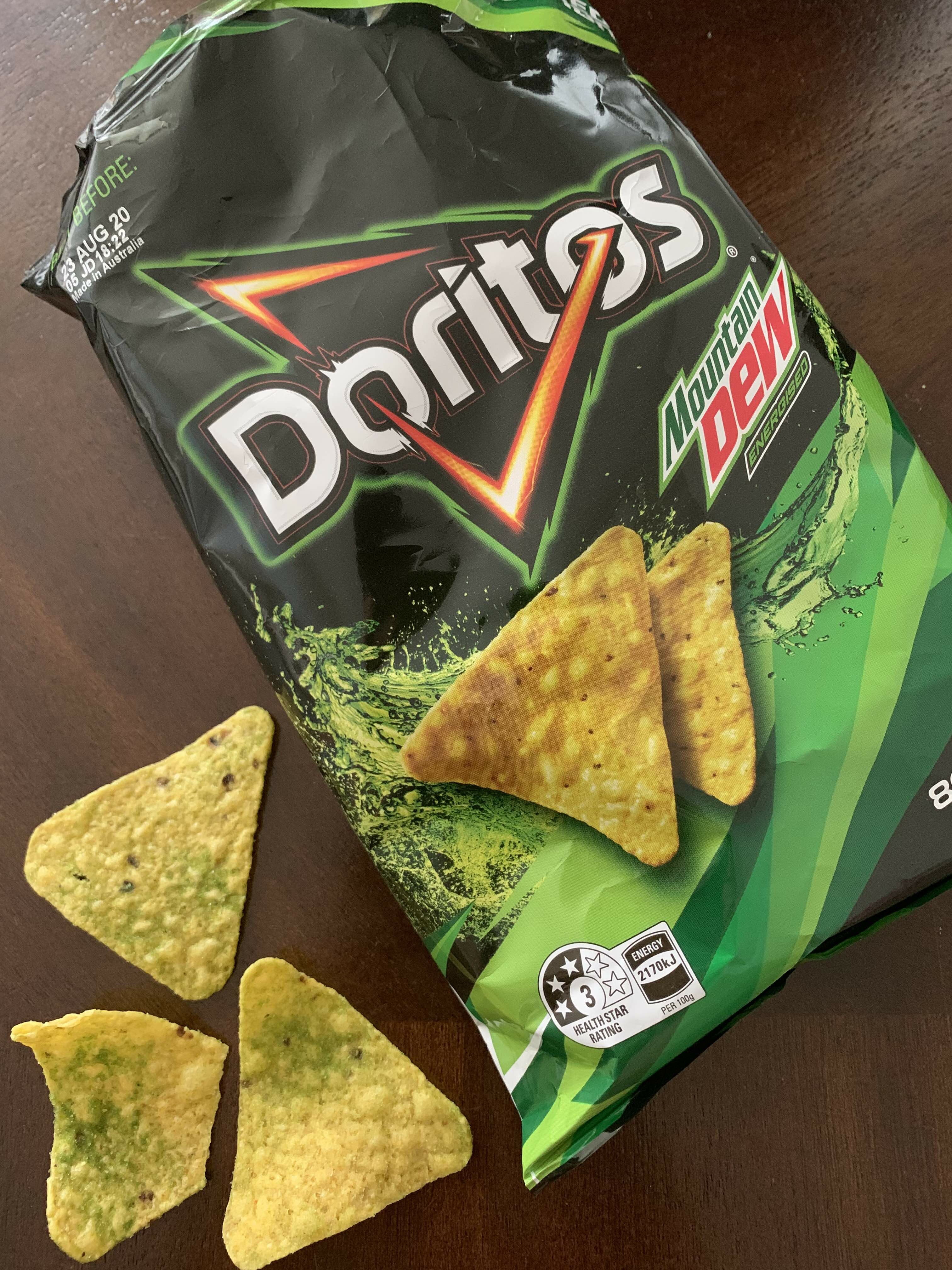 Doritos and Mountain Dew have a history, I’ve discovered. In 2014, they taste-tested Doritos-flavored Mountain Dew. “It honestly wasn’t that disgusting,” said one guinea pig, in a failed attempt to give the product a tag line. The experiment failed, but the idea, unfortunately, lived on.